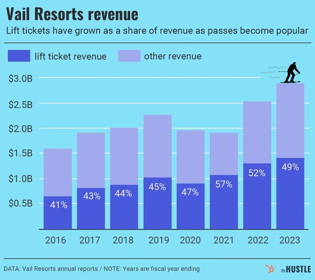 During an earnings call in December 2023, Vail Resorts CEO Kirsten Lynch said passes made up ~73% of the company’s overall lift-ticket revenue, giving the business more stability. The upfront money is a hedge for seasons with lower snowfall and bad weather. Plus, Vail Resorts and Alterra (which has the similar Ikon Pass) can reinvest in lift technology and snow-making and charge a premium for single-day entry.