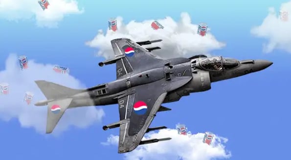 The narrator chimes in — “The more Pepsi you drink, the more great stuff you’re gonna get!” — and the scene shifts to the teen landing a computer-generated Harrier fighter jet in front of his high school, blowing the clothes off a bewildered principal in the parking lot.